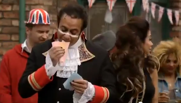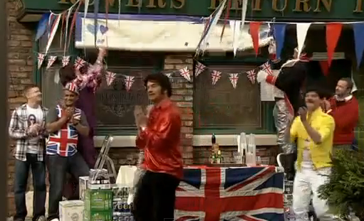 That's a shame, we would have loved to have seen a photo of it, however, I did manage to find a few stills from that episode showing Jason winning Mr. Gay Weatherfield. He was drunk enough not to care that he didn't deserve the title, having girlfriend Tina waiting for him at home. I also spotted you in the bar, so have added that one below too.