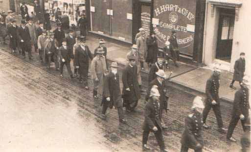 Here is the same Fire Brigade marching through Sandgate. I don't know who all the men marching behind were, but probably the one with the chain around his neck was the Mayor.