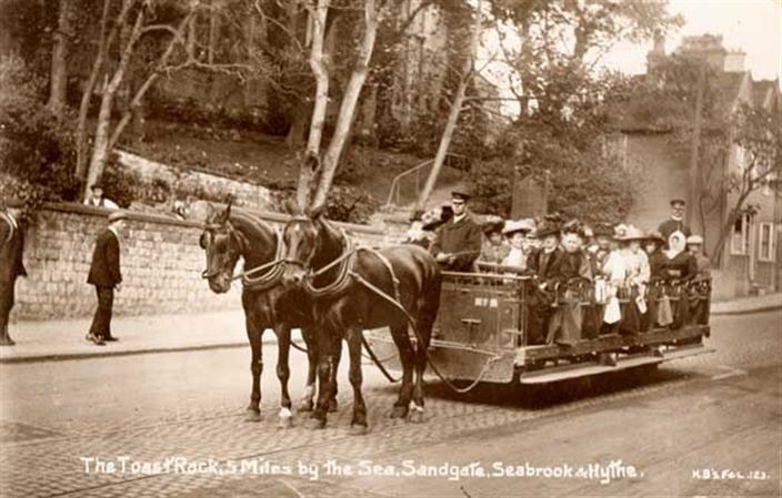 This picture is also on the Hythe and public transport pages,, because this tram service ran through Sandgate, Seabrook and Hythe - and besides, I love this photograph! :-) If you would like to read more on these trams, please check out this very good website: http://www.tramwayinfo.com/ Just click on the postcard index.