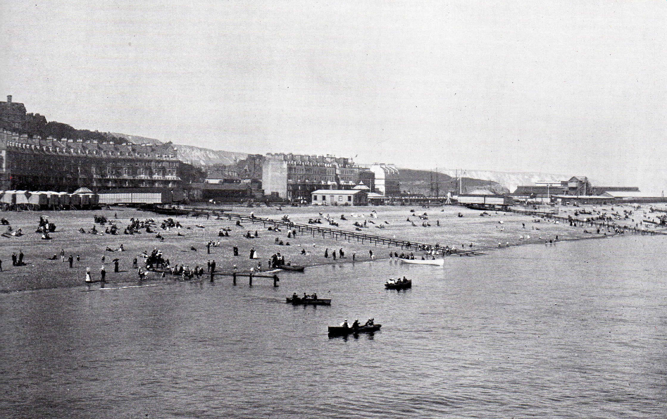 A photograph taken from an old book of views. It was taken from the Victoria Pier Folkestone and shows the West Beach, along with Marine Crescent and Marine Parade, both of which are still there. The photo shows several bathing machines, and two of the W. D. Fagg's Safety Bathing Carriages which ran down to the sea on rails. (An explanation of these is linked from the West Beach page). The only structure I do not recognise, and have not seen it in any other photograph is whatever that is towards the back on the right side of the photograph. Was it to do with the railway pier? Or was it this side of it? If anyone knows, I would love to hear about it.